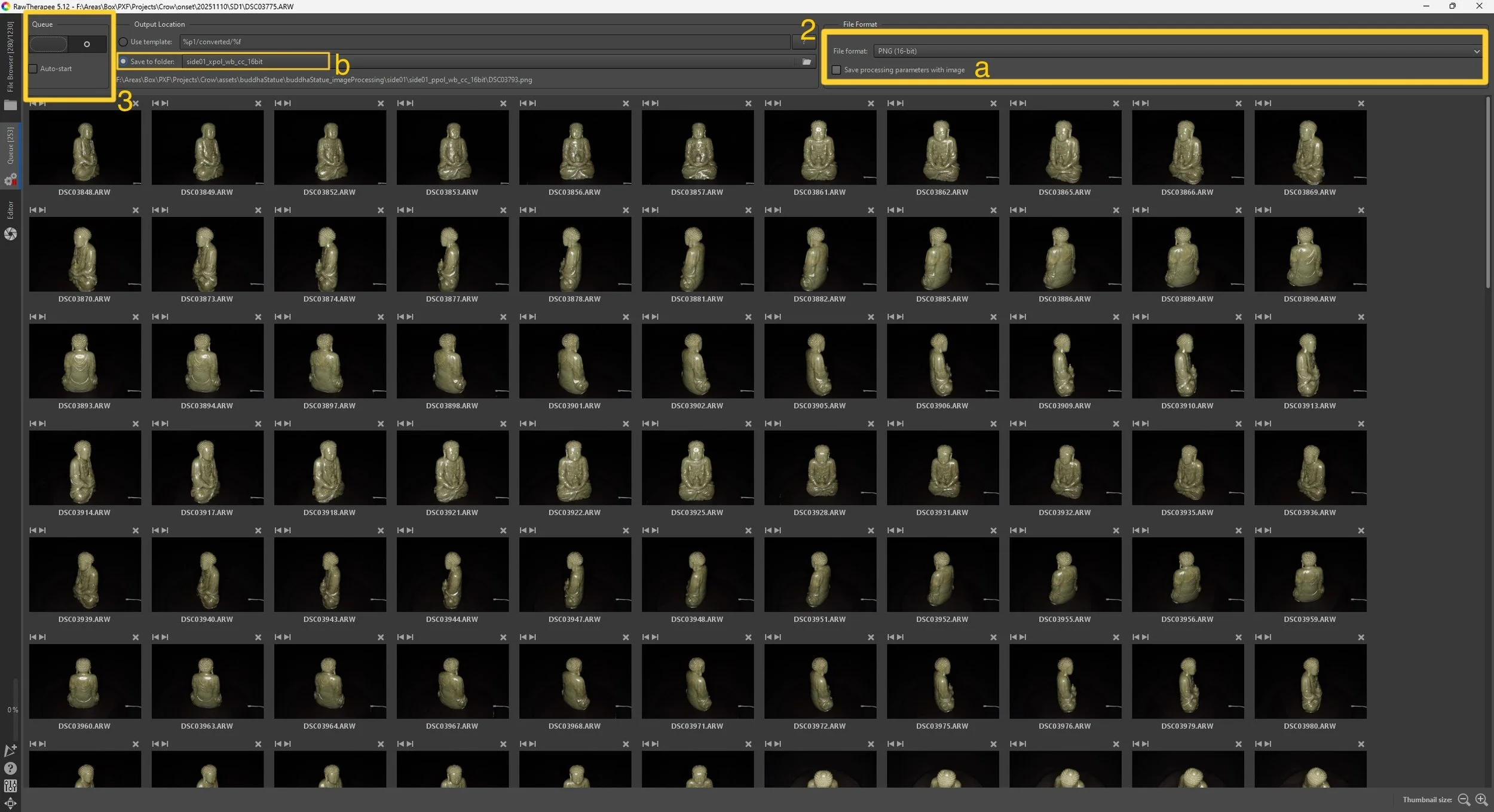 Using the batch queue ensures that all images are exported consistently with identical calibration settings, which is essential for maintaining uniform exposure, color accuracy, and metadata consistency across the full photogrammetry dataset.