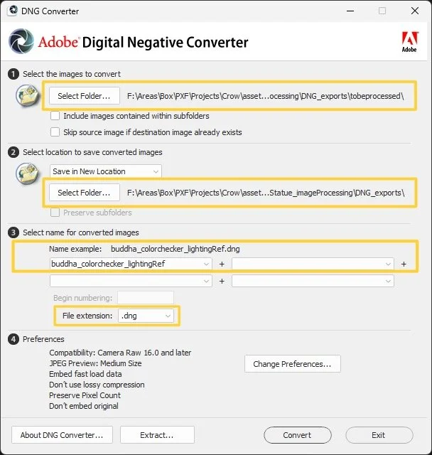 Set the output destination to the DNG_exports folder and run the conversion so these files can be used for camera calibration.