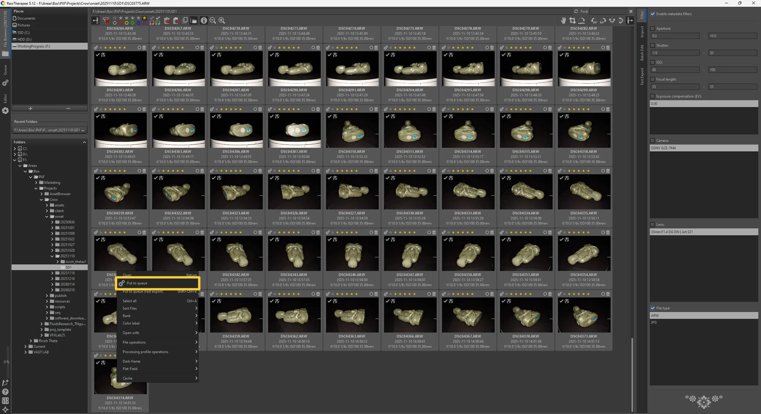 To export the calibrated images, first select all the images that need to be processed inside the File Browser. After selecting the required thumbnails, right-click on any of the selected images and choose “Put to queue.”