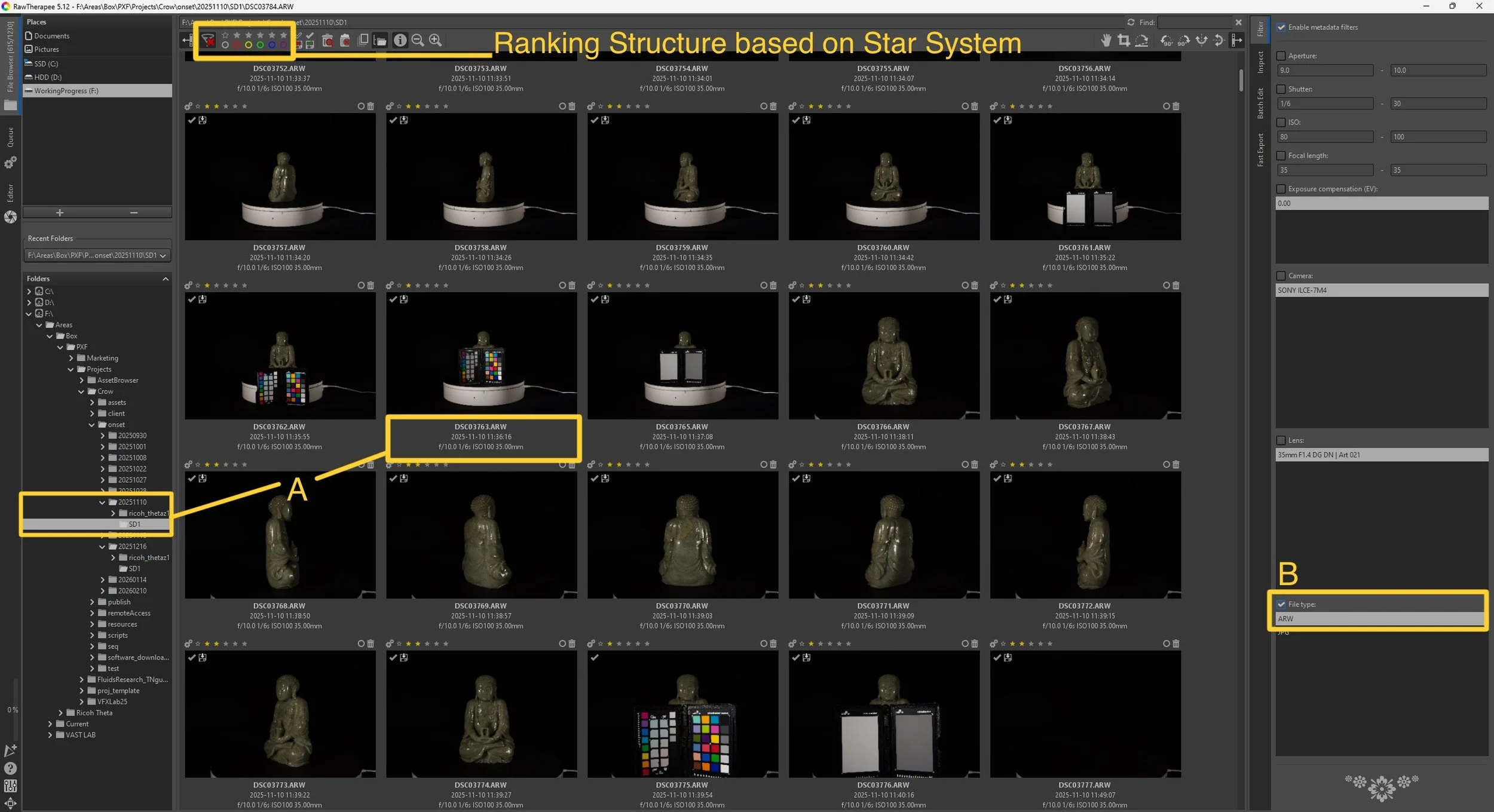 Inside RawTherapee’s File Browser, set the destination path to the scanning session folder to load all captured images.