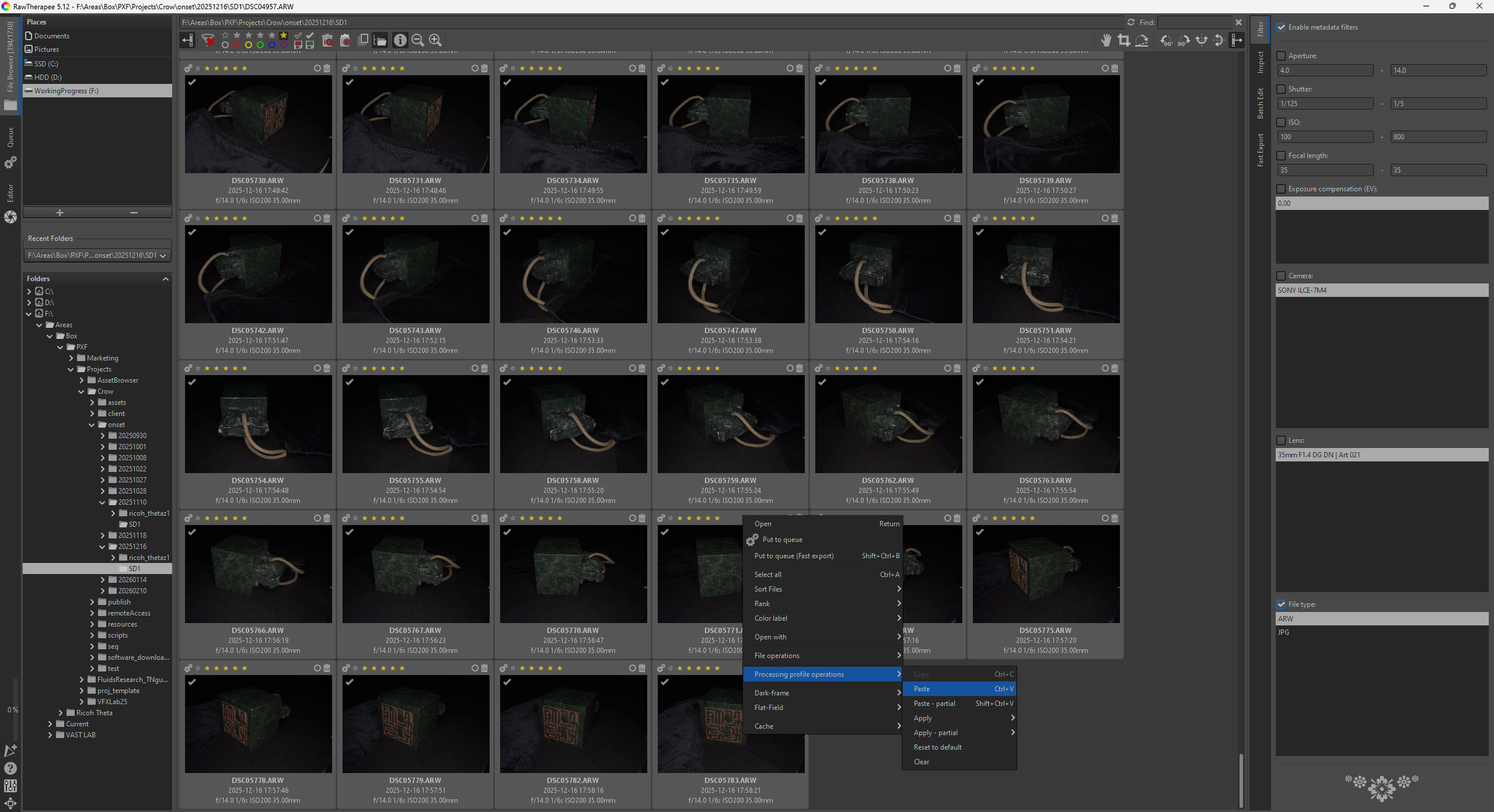 Loaded the Jade Seal scan folder into RawTherapee, filtered for RAW files, and reviewed metadata. Organized images into lighting reference, calibration charts, cross-polarized, and parallel-polarized groups.