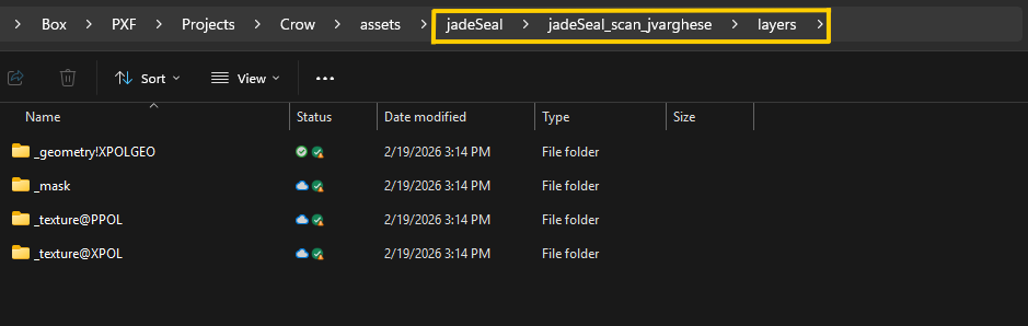 To ensure proper layer stacking, every image across these folders must share the exact same filename. Each capture must correspond one-to-one across geometry, texture, and mask layers so RealityScan can correctly associate the images during processing. (e.g., jadeSeal_01.jpg in geometry must match jadeSeal_01.png in textures).