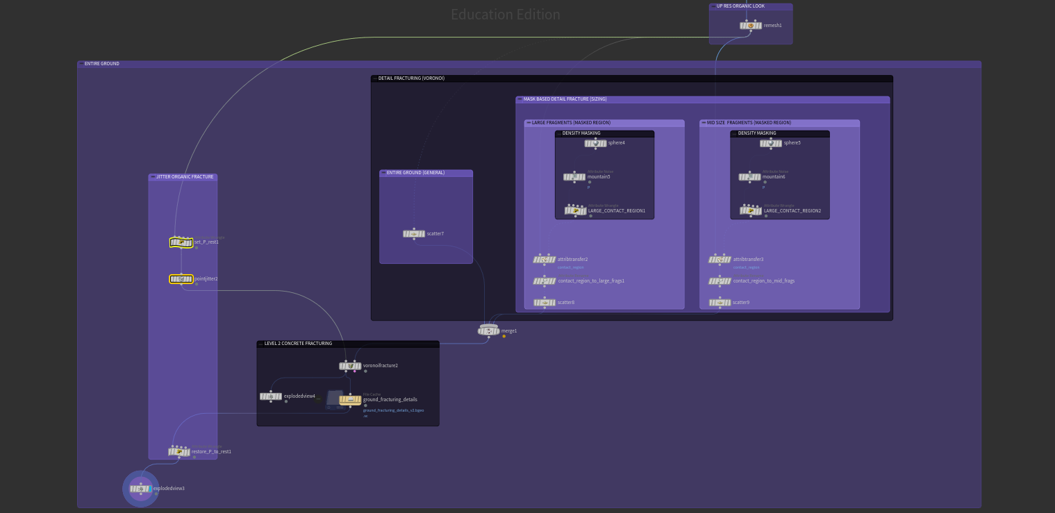 Transferred these attribute-driven scatter points onto the ground geometry, allowing the fracture pattern to be dictated by localized impact stress areas rather than uniform distribution.