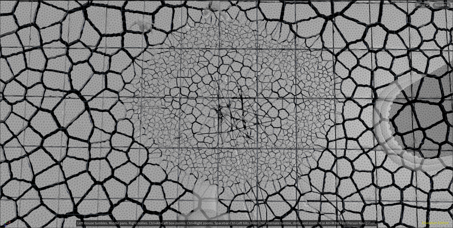 Using the generated tiled ground surface, I focused on capturing the primary fracture region where the photon beam impacts, creating stress-line cracks. The surrounding non-fractured areas are removed, leaving a refined fracture zone. This fractured region then serves as the foundation for the next steps, including RBD fracturing, packing, and defining the active destruction area for a more controlled and intentional breakup.