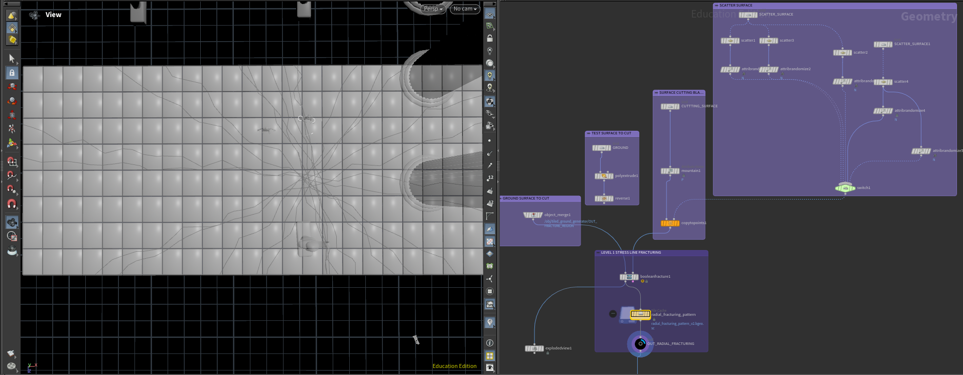 Transferred these attribute-driven scatter points onto the ground geometry, allowing the fracture pattern to be dictated by localized impact stress areas rather than uniform distribution.